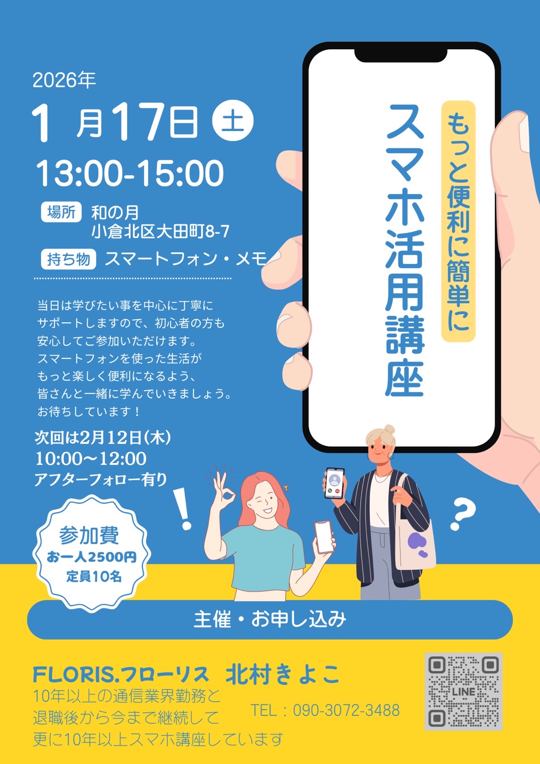 和の月ギャラリーイベント スマホ教室 / 2025年12月25日 1月17日(土) 13:00〜15:00 2月12日(木) 10:00〜12:00 今更だけどスマホ使いこなしたい! こんなことできたら・・・が叶います! もっと読む